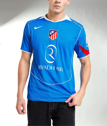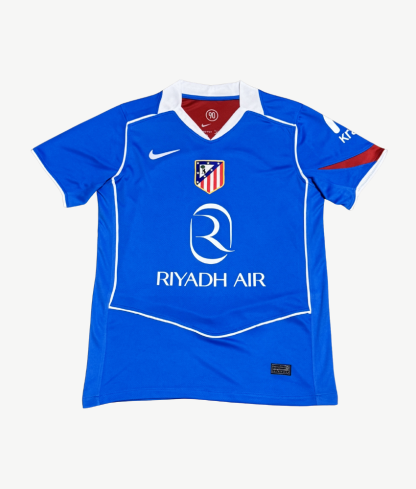Atlético Madrid 25/26 third shirt shines in bold blue with white trim, red sleeve detail, Riyadh Air sponsor, and classic Nike and club crest branding.