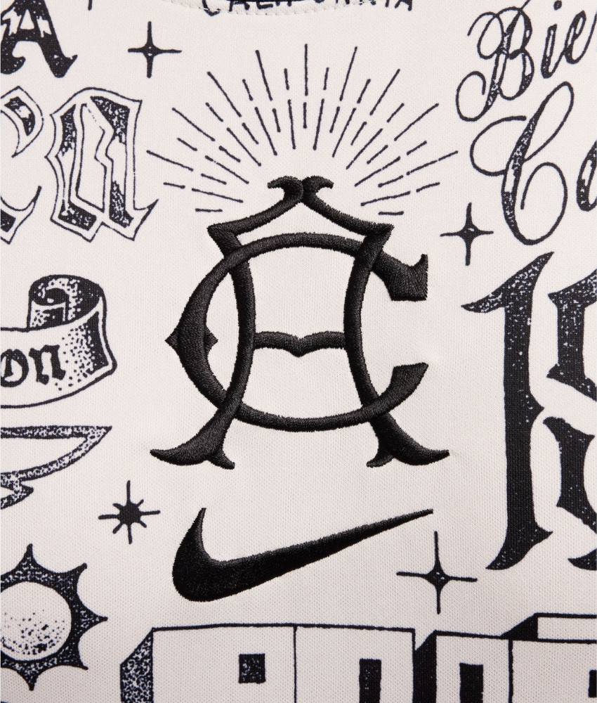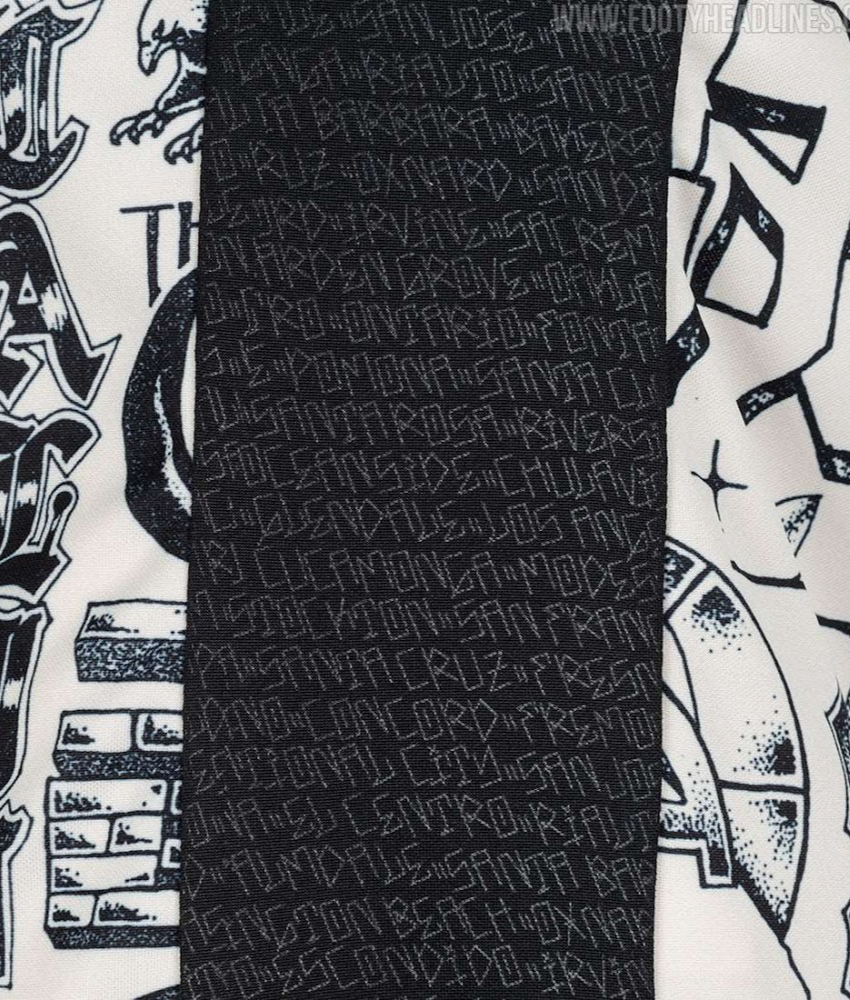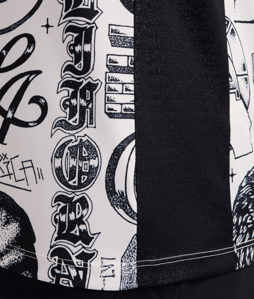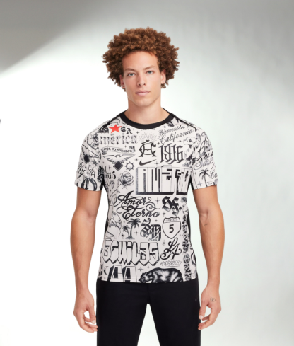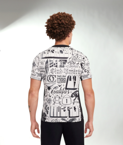 The CLUB AMERICA 2024/25 training shirt is predominantly off-white, with a dense array of street-style graphics on both the front and back for a truly unique look.