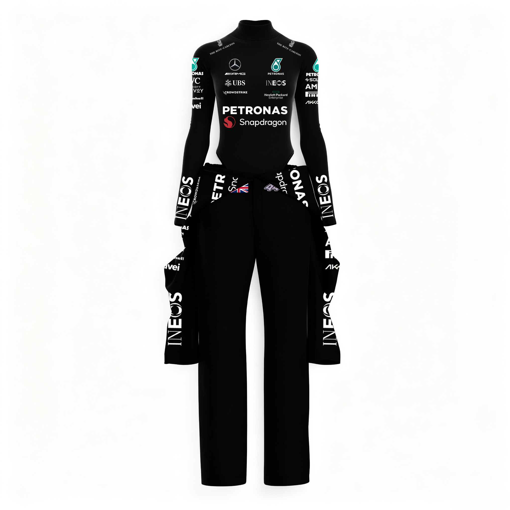 •    Design Elements: Branded logos and text, sleek silhouette, adjustable waist tie