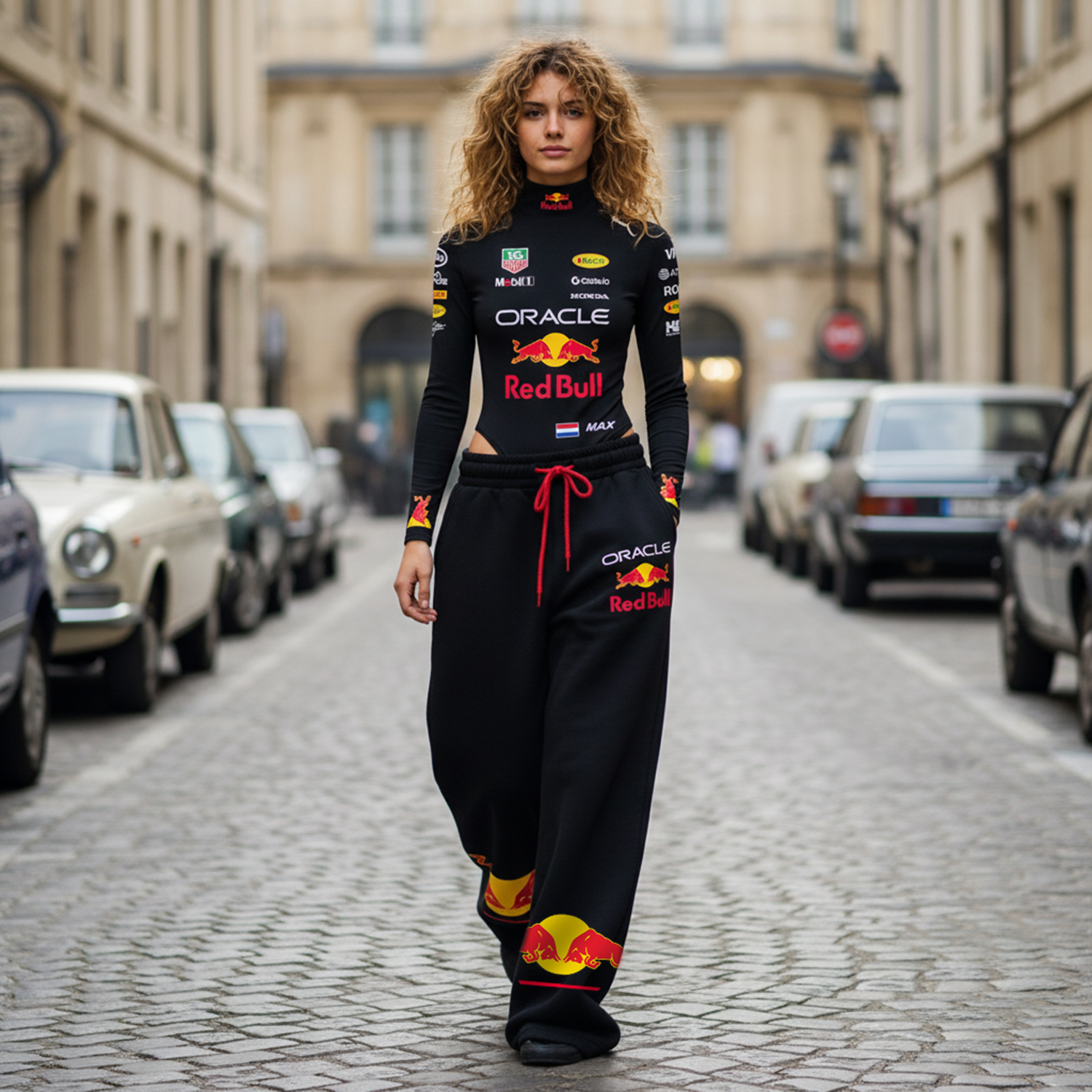 • Details: Full-Body Sponsor Logos, Elastic Waistband with Drawstring, Side Stripes, Cuffed Ankles, Long Sleeves