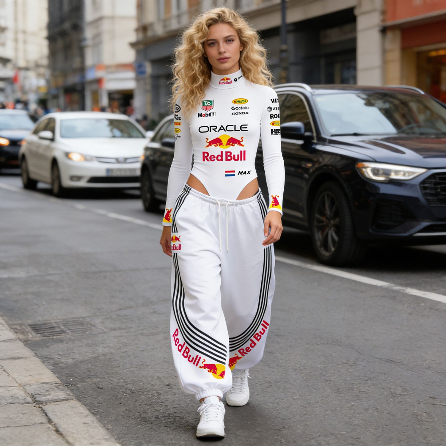 White Racing-Inspired Bodysuit and Sweatpants Set with Bold Logo Design